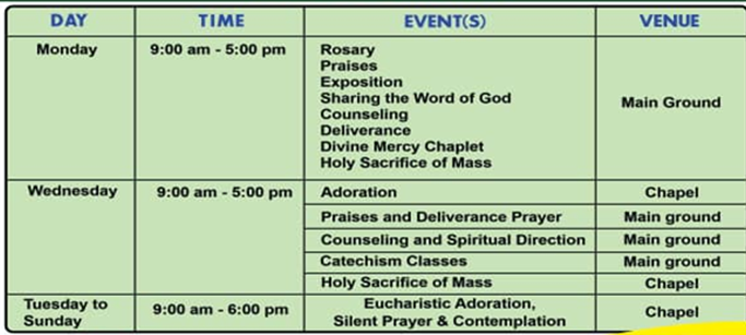 Adoration is done at the main Ground (9:00am-3:00pm)