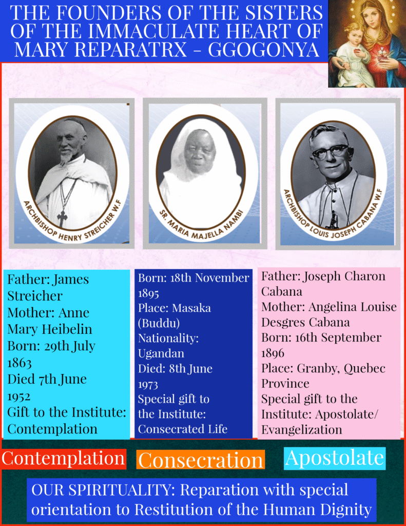 The Institute of the Sisters of the Immaculate Heart of Mary Reparatrix- Ggogonya (IHMR), is of a diocesan rite and was founded in 1927 with inspiration of the Holy Spirit by Archbishop Henri Streicher (WF), Sr. Maria Majella Nambi and Archbishop Louis Joseph Cabana (WF). In 1948, it was elevated to its canonical status. Read more
